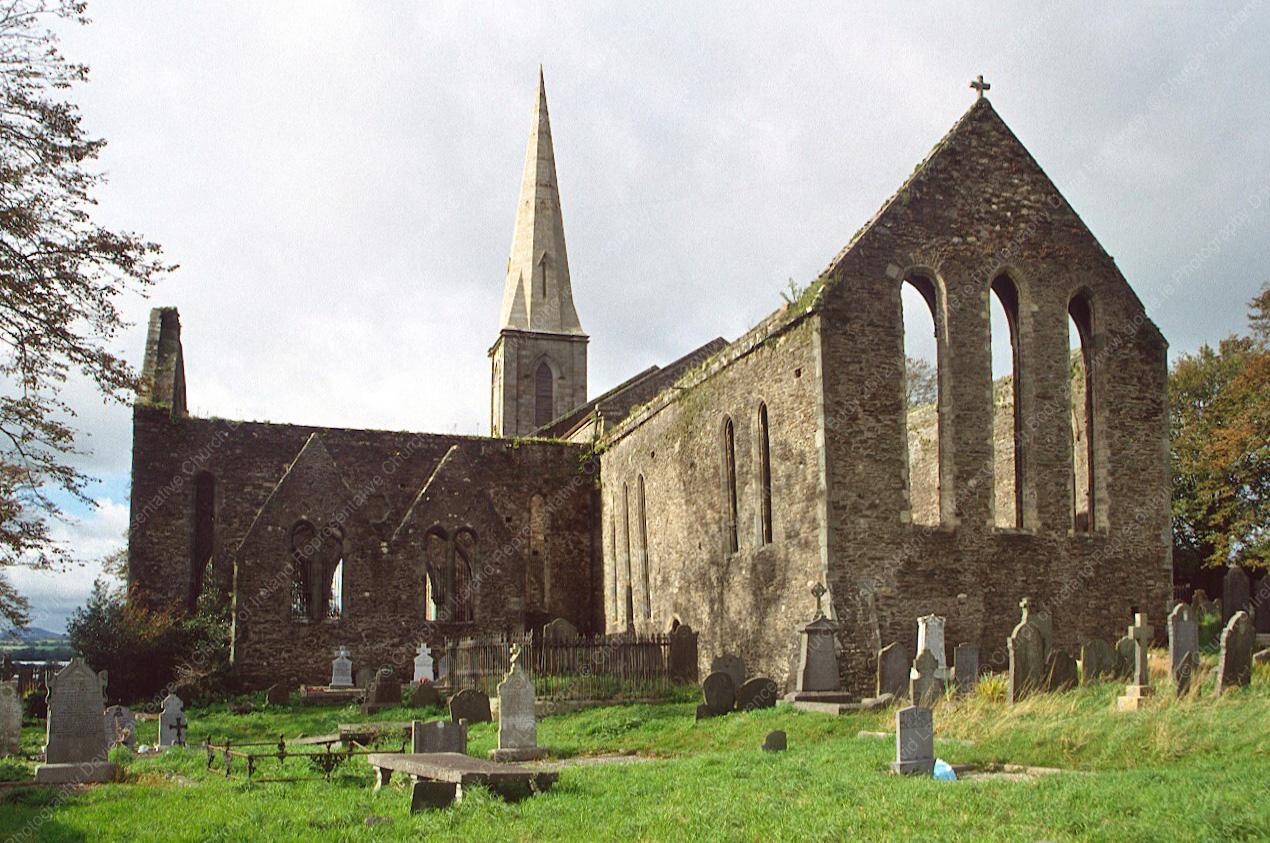 The thirteenth-century chancel and transepts are roofless; nave demolished and replaced, 1813 by unknown architect; sanctuary built into former crossing; fenestration, 1892 by J.F. Fuller.
