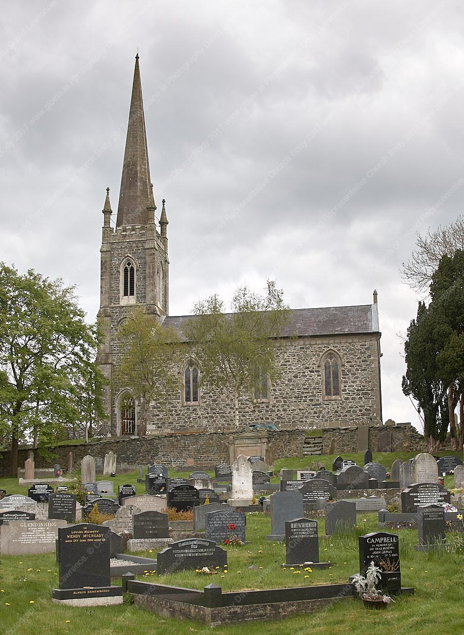 Chancel, W tower and tall spire, 1822. High on rocky mound. Architect not identified. Highly distinguished building, inside and outside. Rare example of unaltered prayer-book interior with box pews, pulpit and desk. Vaulted roof. Carved corbel table.
